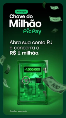 Para participar basta cadastrar sua chave Pix no PicPay. Você concorre a R$1 milhão no sorteio final e a prêmios semanais em dinheiro. Abra a sua conta PJ no PicPay Empresas e garanta um número da sorte extra! Quanto mais PicPay você usar, mais chances você tem para concorrer.