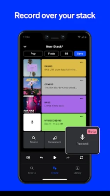 Create Mode leaves creative control in your hands—shuffle to create a whole new Stack or add new layers of compatible sounds and your own recordings. If you want to replace a single loop with a new option of the same type of sound, swipe right. If you want to delete the layer altogether, swipe left. You can also solo a layer by holding down, or tap the layer to mute. Once you’ve chosen your Stack layers, you can fine-tune your loop with volume adjustments and BPM control. When your idea hits the spot, save it with a click. You can also click the Stack icon to hear any individual loop in the Splice library in musical context with Create mode.